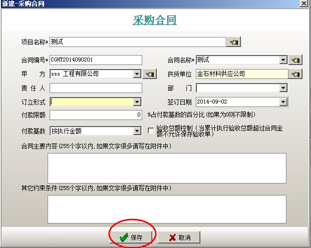 打開采購合同,左側選擇相應的項目,右邊點新建,錄入采購合同相關信息,保存。