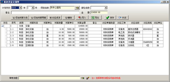 例如下圖所示:預(yù)算分類為設(shè)備,明細(xì)科目為凈化設(shè)備,對應(yīng)的名稱可以為高效過濾器、移動式消毒車、烘手器等。