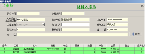 以上面的借款為例,我們來做一張付款申請單,首先是做業(yè)務(wù)單據(jù),采購相應(yīng)設(shè)備(這里設(shè)備不是公司的固定資產(chǎn),而是需要給客戶安裝的設(shè)備,所以是歸到材料類中)應(yīng)該做采購入庫單(材料采購單)。
