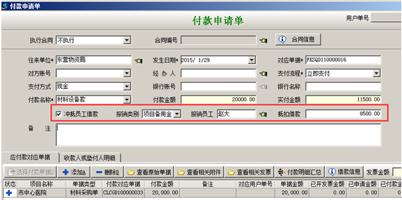 請款人去辦理相關(guān)業(yè)務(wù)之后(如:采購相應(yīng)設(shè)備、支付相關(guān)運費等),是針對借款做報銷,首要根據(jù)業(yè)務(wù)類型,創(chuàng)建好相關(guān)業(yè)務(wù)單據(jù)(采購設(shè)備是先做采購入庫單),然后根據(jù)業(yè)務(wù)單據(jù)發(fā)起付款申請生成【付款申請單】,填寫【付款申請單】時要選擇沖抵員工借款,把之前的借款沖抵掉,這樣在員工借款單統(tǒng)計表中,報銷欄就會有相應(yīng)的累計。