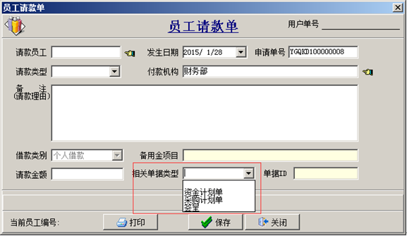 這時的【員工請款單】較為簡單,只提供了備注、與附件功能,給審核該單據(jù)的管理人員造成了一定的難度。為了解決這一問題軟件改進(jìn)了【員工請款單】給請款單中增加了三個來源:【資金計劃單】、【采購計劃單】、【簽呈】,以方便在員工請款審核中,查看請款理由是否合理。其中【采購計劃單】和【簽呈】是軟件中一直存在的模塊,直接關(guān)聯(lián)的計劃單號和簽呈單ID。