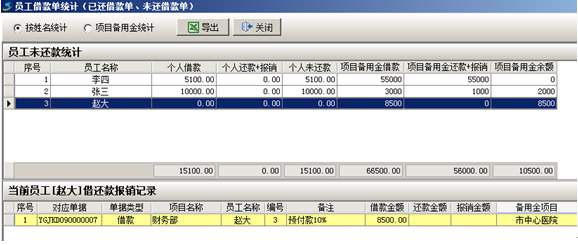 請款審核完成后,接下來是財務(wù)人員把錢支付給請款人然后執(zhí)行【員工請款單】生成【員工借款單】。下圖所示:生成【員工借款單】后在員工借款單統(tǒng)計中可以看到,目前借款人趙大,項目備用金借款為8500元。