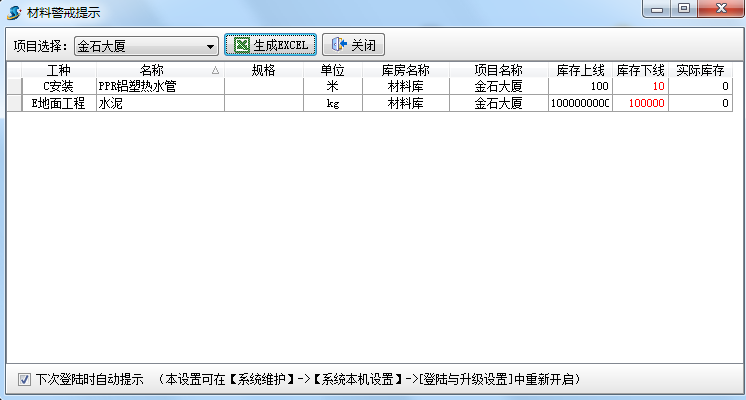 我們也可以設(shè)置登錄軟件時自動提示庫存警戒。設(shè)置好之后當(dāng)材料的庫存量達(dá)到了預(yù)警設(shè)置中設(shè)置的上限或者下限,登錄時會自動彈出提示。