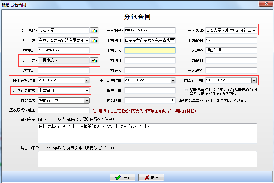 選中[金石大廈]項目點擊【新建】來建立一個合同,界面如下: