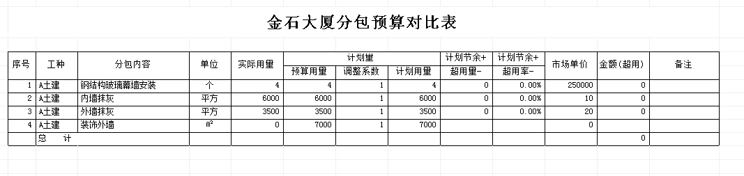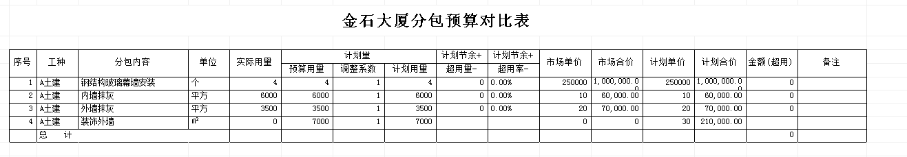 備注:調整系統說明:在實際的工程量投標中,某些施工企業(yè)為了中標而做低預算量,還有其它的原因如:一些分包根據以往的施工經驗總會有一定的偏差。這里用調整系數是為了將最終要參與比較的【計劃用量】、【計劃用量】調整到接近于預期最真實的值。