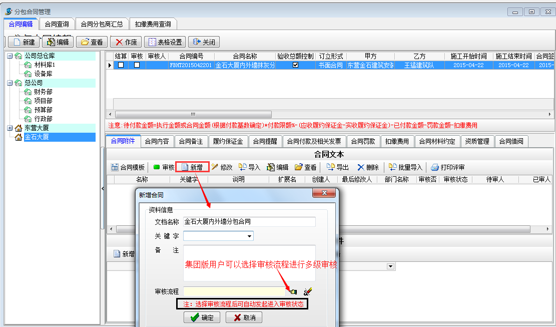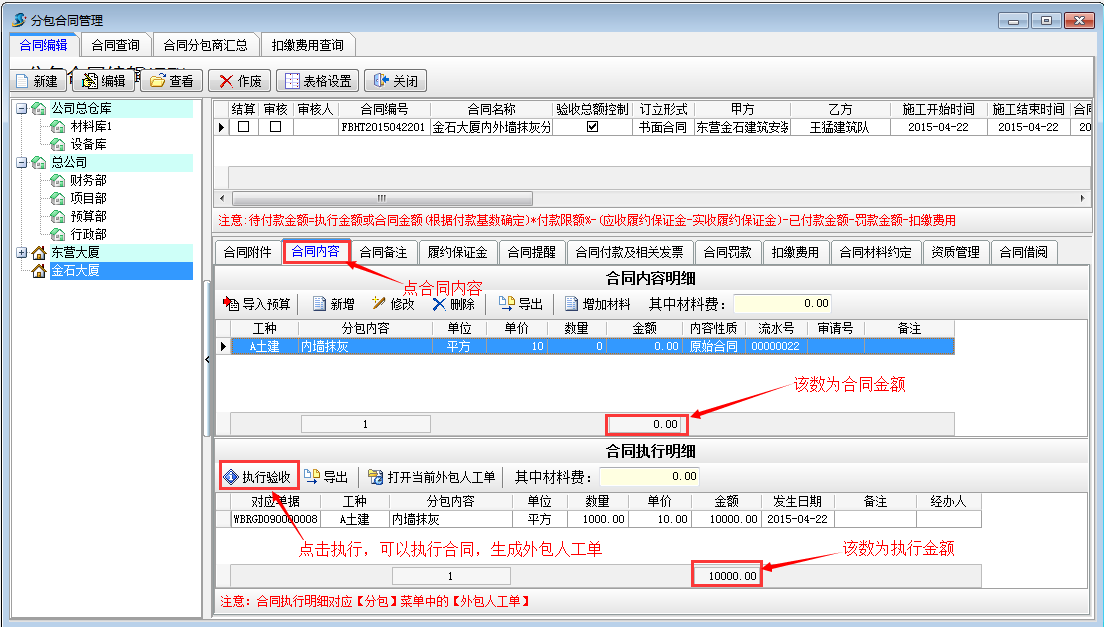 經年底現場審核,確定完成內墻4000平米,外墻2000平米,向施工隊付分包款,并扣除生活費。我們在合同內容處選擇執(zhí)行驗收或者直接做外包人工單,外包人工單可進行多級審核.
