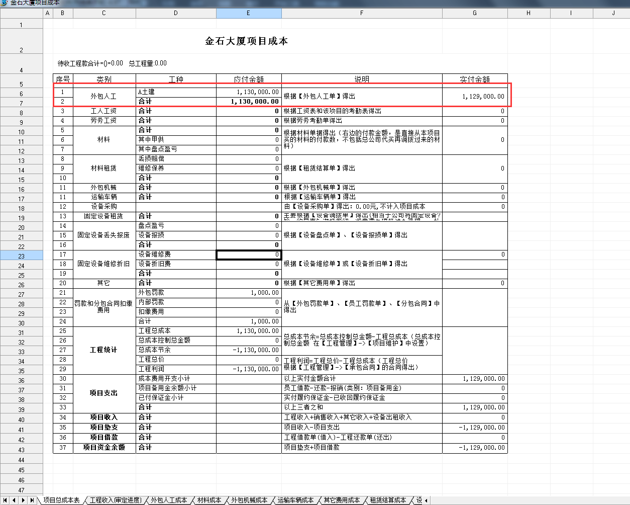 下面我們看下金石大廈成本匯總表: