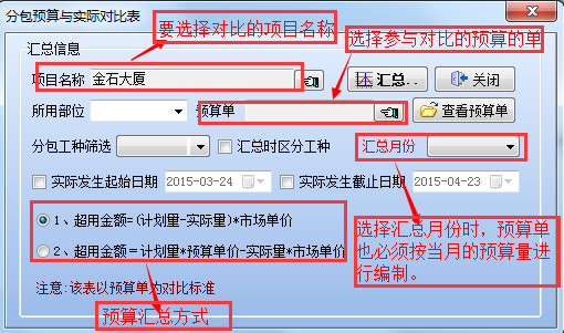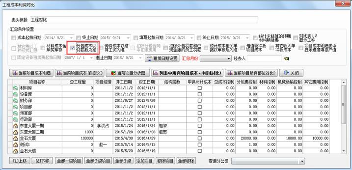 (3)【分包預算與實際對比表】是項目的分包預算單與實際發(fā)生的分包進行量價的對比。對比窗口界面設置如下