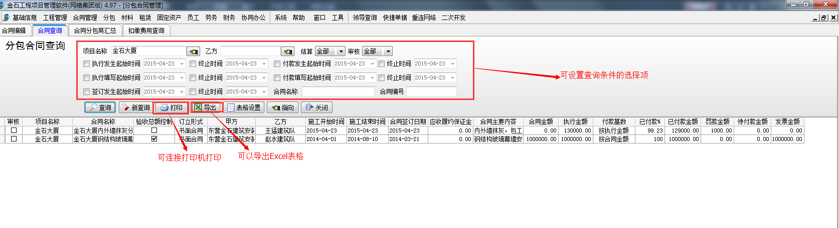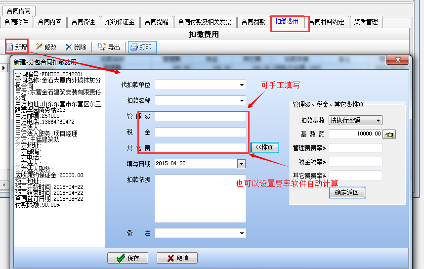 工程項目分包管理合同 是與分包商或施工隊簽訂的合同,包括【合同編輯】、【合同查詢】、【合同分包商匯總】、【扣繳費用查