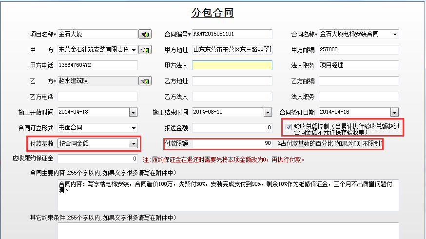 上圖帶紅框的注意填寫正確,其中帶*為必填項。尤其注意【付款基數】、【付款限額】這些項都會直接影響到該合同的待付款。
