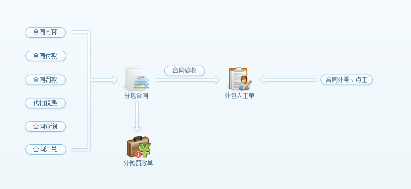 工程項目分包管理,可用于統計專業(yè)分包產生的成本及臨時雇用的零工成本。如軟件流程圖所示:分包成本是由外包人工單產成,其來源可分為兩部分,第一:來自分包合同中的合同驗收,第二:來自合同外零、點工驗收。