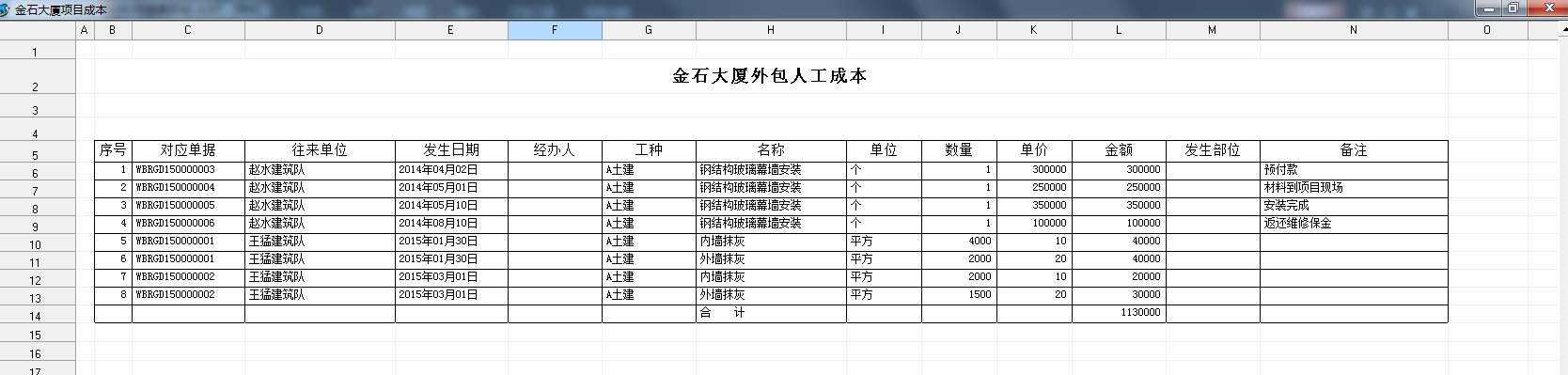 如下圖:查詢項目為【金石大廈】的外包人工成本。