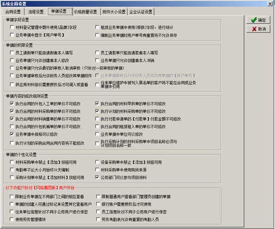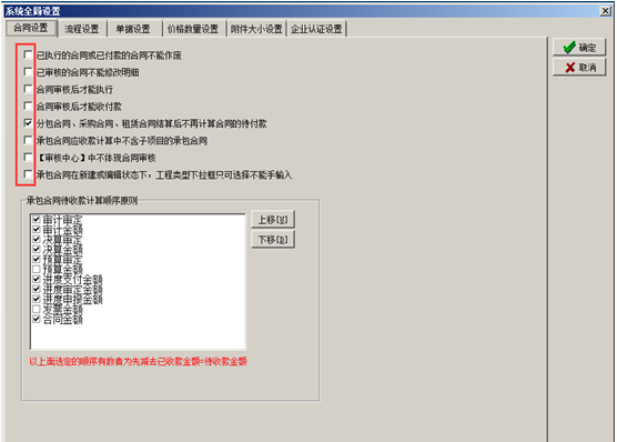 進(jìn)入系統(tǒng)的“系統(tǒng)維護(hù)”-“系統(tǒng)全局設(shè)置”彈出系統(tǒng)全局設(shè)置的對話框,點(diǎn)擊“合同設(shè)置”,在對應(yīng)的復(fù)選框打鉤代表合同受對應(yīng)開關(guān)的控制,如圖: