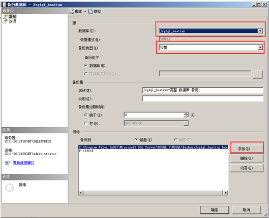 在“對象資源管理器”找到想要進行備份的數據,選中點擊鼠標右鍵,點擊“任務”-“備份”,彈出“備份數據庫”的對話框,備份類型選擇“完整”,“目標”是備份文件的位置,可以自定義一個比較好找的目標,這樣備份以后就可以方便的找到備份文件了,設置完成點“確定”即可,然后到目標目錄下找到備份文件就是所需的備份文件,如圖: