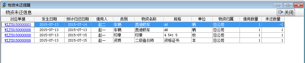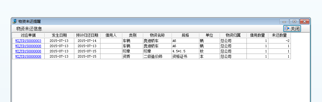 在填寫物資借用單時,填寫好預(yù)計(jì)歸還日期,當(dāng)?shù)筋A(yù)計(jì)歸還日期時,會自動提醒物資未還信息。如下圖: