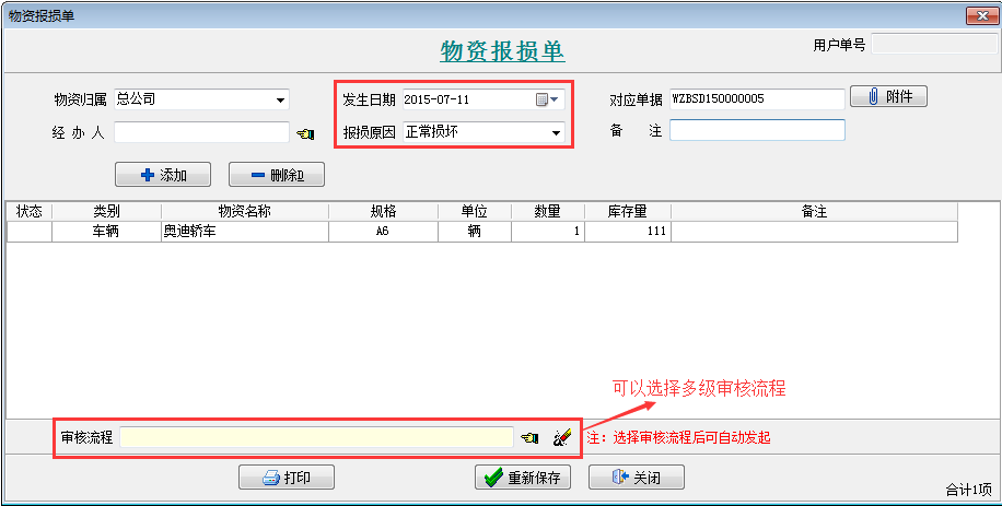 【物資報(bào)損單】是用來報(bào)損物資的業(yè)務(wù)單據(jù)。 類似【材料報(bào)損單】或者【設(shè)備報(bào)損單】,一個是針對物資報(bào)損,一個是針對材料或者設(shè)備報(bào)損。