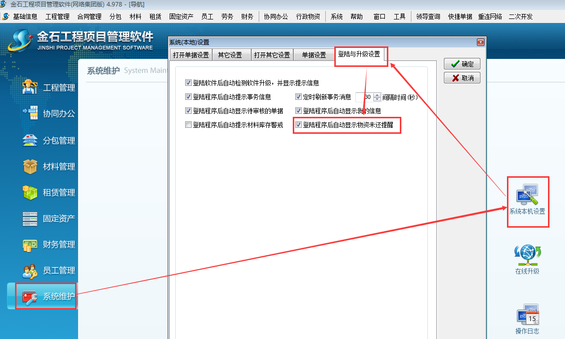 還可以設(shè)置登錄客戶端后自動顯示物資未還提醒。
