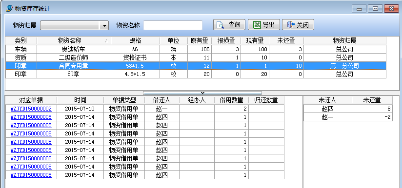 物資庫存統(tǒng)計(jì)可以很方便查詢物資的借還記錄,物資借還人以及物資的未還量。當(dāng)物資借用人想借用物資時,可以先查看物資庫存統(tǒng)計(jì),方便借用物資。