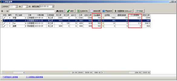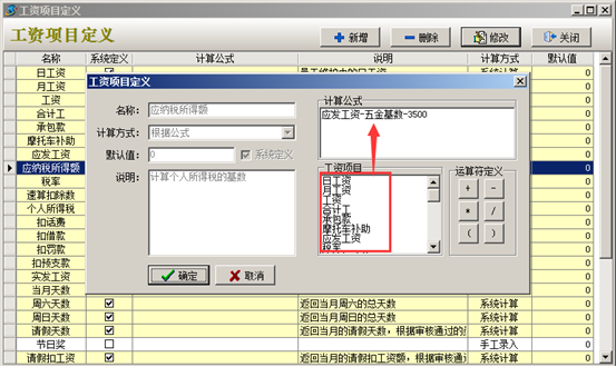 工程項(xiàng)目管理軟件中“五金基數(shù)”及“個(gè)人所得稅”在工資項(xiàng)目定義中設(shè)置好之后,在生成工資表時(shí)系統(tǒng)會扣除對應(yīng)金額。如圖: