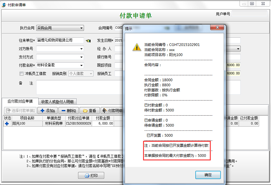 現在針對該采購合同進行付款,根據軟件控制,最大可付金額為發(fā)票金額5000,超過5000,軟件會有超付提示,并且并且付款申請單或者付款單不能保存。如下圖: