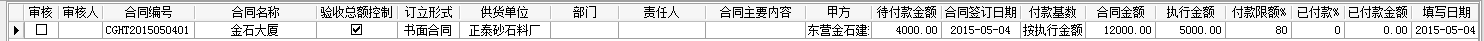 我們建立一個總價為12000的采購合同,付款基數(shù)按執(zhí)行金額,付款限額為80%。如下圖