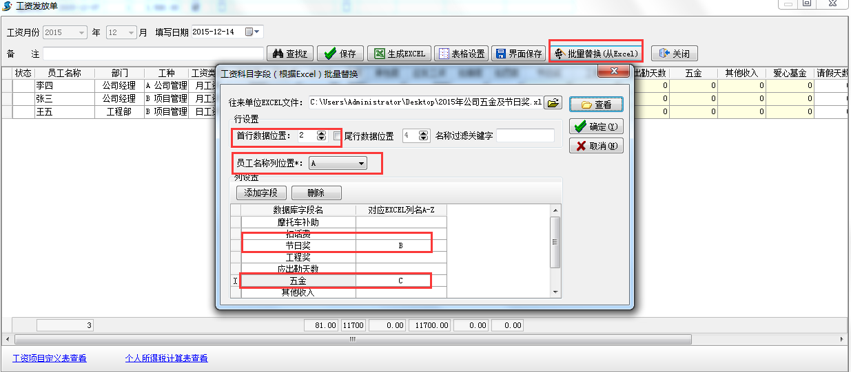 本地帶有員工本月五金和節日獎字段的表格中所對應的列分別是“B”列和“C”列,列名對應好之后,點擊“確定”進行替換,導入并替換完成之后會彈出“導入完成”的對話框,如圖: