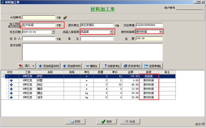 注:(1)在材料加工單的材料列表中對應好各材料所在的庫房。否則系統會默認為默認的“成品入庫庫房”或“原材料庫房”。