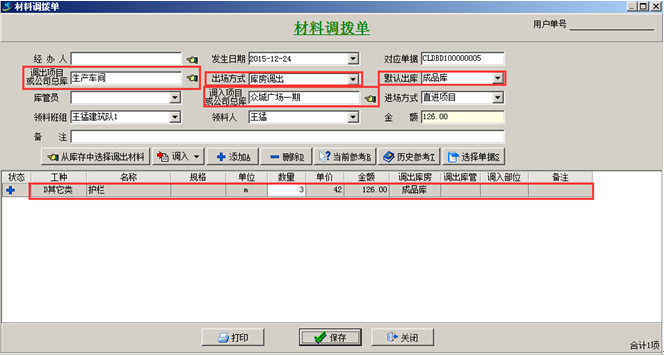 項目上使用產成品時,需要從“生產車間”將產品調撥到項目上,在工程管理軟件中做“材料調撥單”,填寫調撥單時,調出項目要選擇“生產車間”,出廠方式選擇“庫房調出”,并選擇對應的庫房,選擇對應的調入項目以及“領料班組”和“領料人”。如圖: