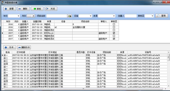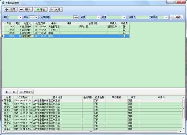 在考勤設備讀取操作界面也有相應的查詢篩選項,可以通過年份、月份、項目名稱、設備、來源、創建人、審核否等相關信息來篩選查詢從考勤設備讀取的信息。