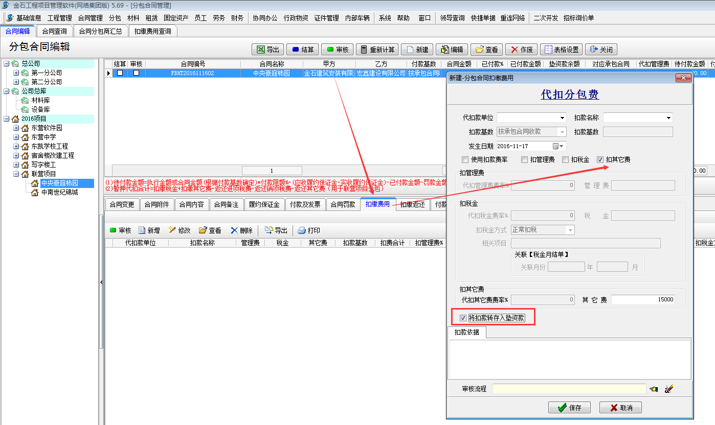 在建立分包合同時可選擇在“付款前扣款”處打鉤,這樣在付款前,必須做扣繳費(fèi)用才能付款,避免有忘記扣款的情況。具體參見文章“分包合同付款前扣款的使用”index.php?c=msg&id=1529&