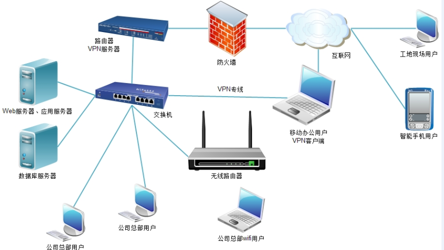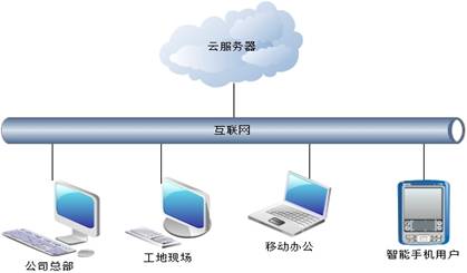 普通版,適用于操作員在公司總部辦公為主的公司,服務(wù)器架設(shè)在公司總部,工作總部工作人員可通過公司部署的局域網(wǎng)訪問服務(wù)器,工地現(xiàn)場及移動辦公用戶采用互聯(lián)網(wǎng)訪問的方法使用軟件,為了訪問穩(wěn)定及數(shù)據(jù)安全可以在公司總部架設(shè)vpn 或域名解析軟件,廣域網(wǎng)操作用戶采用vpn撥號、或域名訪問的連接的方式連入公司局域網(wǎng)內(nèi)。