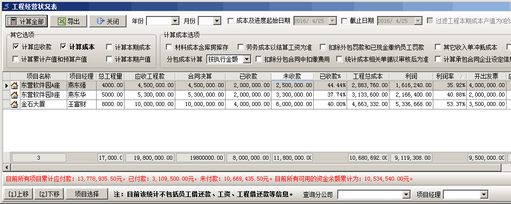 可查詢出項目(包括所有項目、某一子公司的項目、某資質(zhì)承接的項目、某項目經(jīng)理承包的項目、某開工年度的項目)結(jié)算進(jìn)度、應(yīng)收工程款、已收款、未收款、工程總成本、完成產(chǎn)值、利潤、開出發(fā)票、收到發(fā)票等信息,并統(tǒng)計出目前可用資金余額。