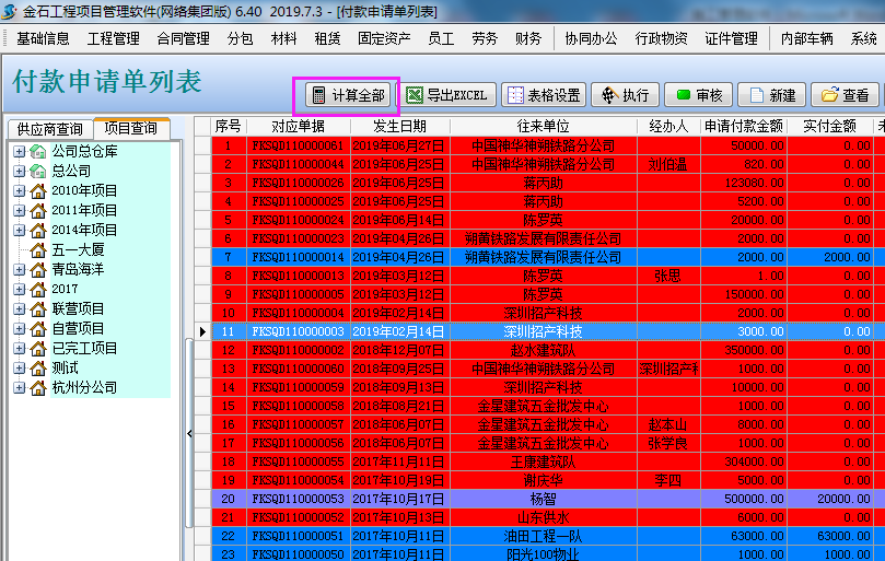 設置完成后點付款申請單列表中的“計算全部”這樣系統就會根據我們的設置彈出不同的顏色,就能快速的找到哪些沒有執行付款、哪些已經付款完成、哪些部分執行付款。