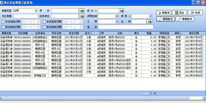 設備使用記錄功能主要由固定設備萬能查詢模塊實現。該模塊由相關機械設備負責人主持,在設備領用時登記相關信息,包括不限于:該設備對應單據編號、往來的單位、設備調撥的歸屬項目,使用日期、登記信息的責任人、設備類別、具體的名稱、數量、領用班組、領用人、填表時間等信息。