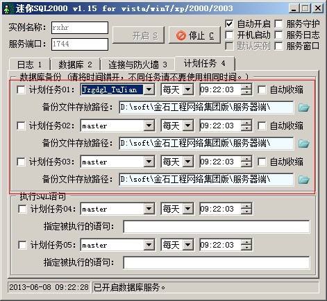 打開服務(wù)器端,到第四選項卡計劃任務(wù)中,選擇好需要備份的數(shù)據(jù)庫名稱、