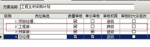 在多級(jí)審核中,可以設(shè)置多套審核方案,每套方案可設(shè)置多個(gè)崗位,可設(shè)置方案的授權(quán)發(fā)起用戶(在業(yè)務(wù)單據(jù)中選擇該審核方案的用戶)。在添加方案時(shí),有三種方式逐級(jí)審核、平級(jí)審核、跨級(jí)審核。逐級(jí)審核是指各個(gè)崗位按先后順序依次審核該業(yè)務(wù)單據(jù),例如審核順序?yàn)椋こ滩俊㈩A(yù)算部、經(jīng)營(yíng)部、總經(jīng)理如下圖: