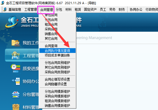 “采購合同”、“分包合同”、“租賃合同”、“其他合同”等查詢項,過去這些查詢項只能單獨查詢各自所對應的 材料、分包、租賃、其他費,不能提供系統的匯總數值查詢,鑒于此,金石工程項目管理軟件新版本中新增 “合同執行情況查詢”用于對下游合同的綜合匯總查詢。
