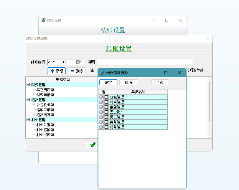 【系統維護】中增加了【結賬設置】功能,設置結賬時間點八大業務單據,將不能再補錄發生日期早于結賬日期的單據。