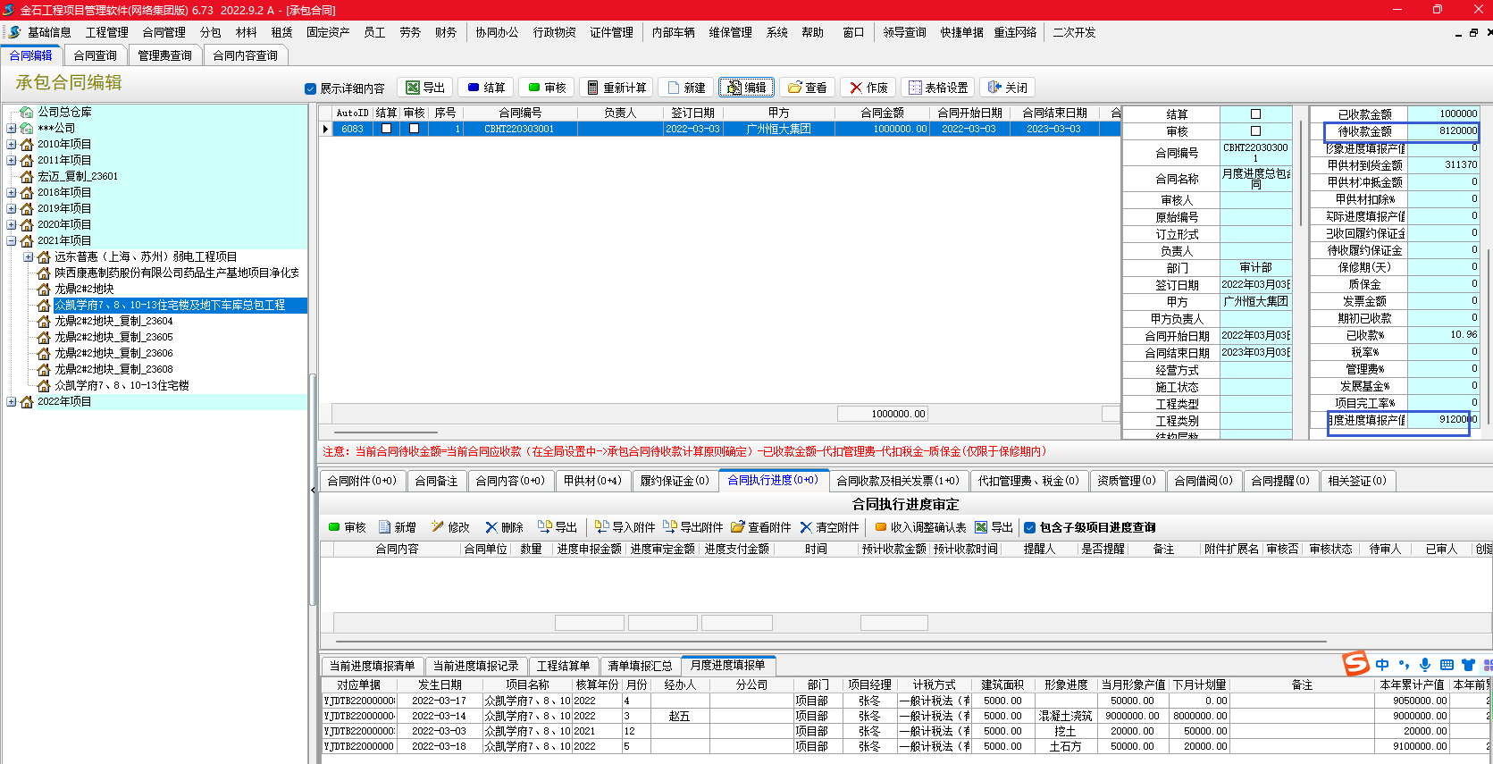 可以根據承包合同待收款計算原則設置以月度進度填報為準。