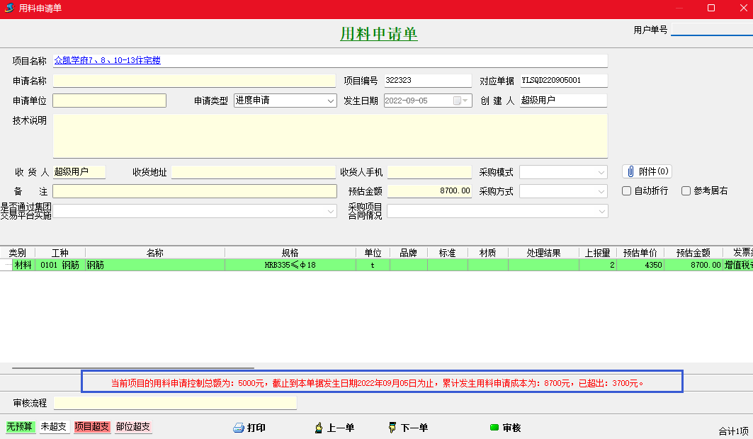 金石工程項目管理軟件項目維護增加用料申請控制功能,用于控制用料申請控制,超出控制金額系統會自動報警。