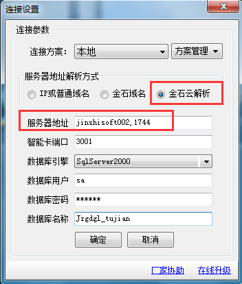 在做連接設(shè)置時直接選擇使用IP或計算機(jī)名稱,不要選擇金石云解析。如下圖是金萬維解析: