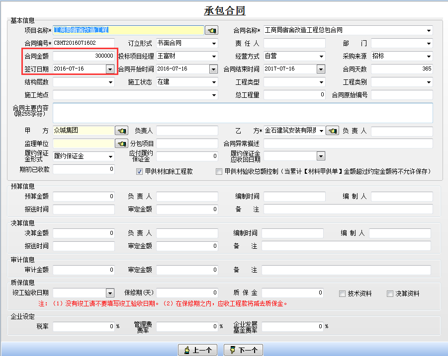 填寫好相應的項目信息后,建立施工項目管理軟件承包合同。