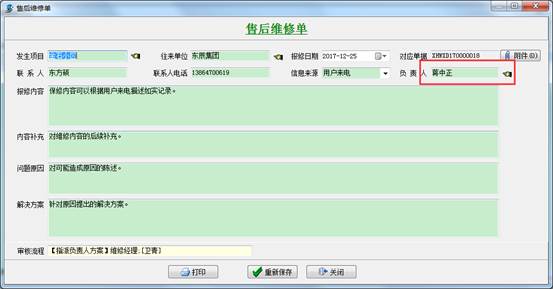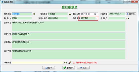 分管員接到用戶電話,根據(jù)用戶的描述手動(dòng)添加【售后維修單】,填寫必要內(nèi)容,如發(fā)生項(xiàng)目,單位名稱,報(bào)修的內(nèi)容等,然后選擇審核流程方案,提交給售后部門經(jīng)理審批。
