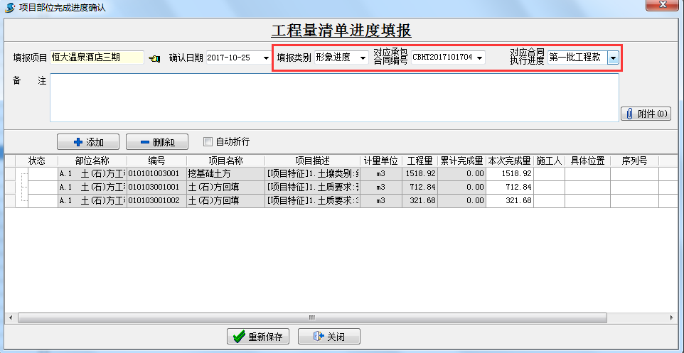 根據(jù)工程量清單填寫形象進(jìn)度(形象進(jìn)度為與甲方結(jié)算的依據(jù)),對應(yīng)“承包合同”和“合同執(zhí)行進(jìn)度”