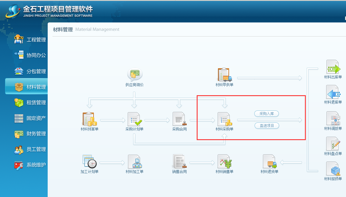 第一步,進入工程項目管理系統的【材料管理】模塊,點擊[采購合同],如圖: