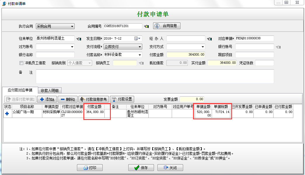 選擇“執行付款”根據向導后系統會自動根據材料單據金額*付款比例,自動得出待付的金額