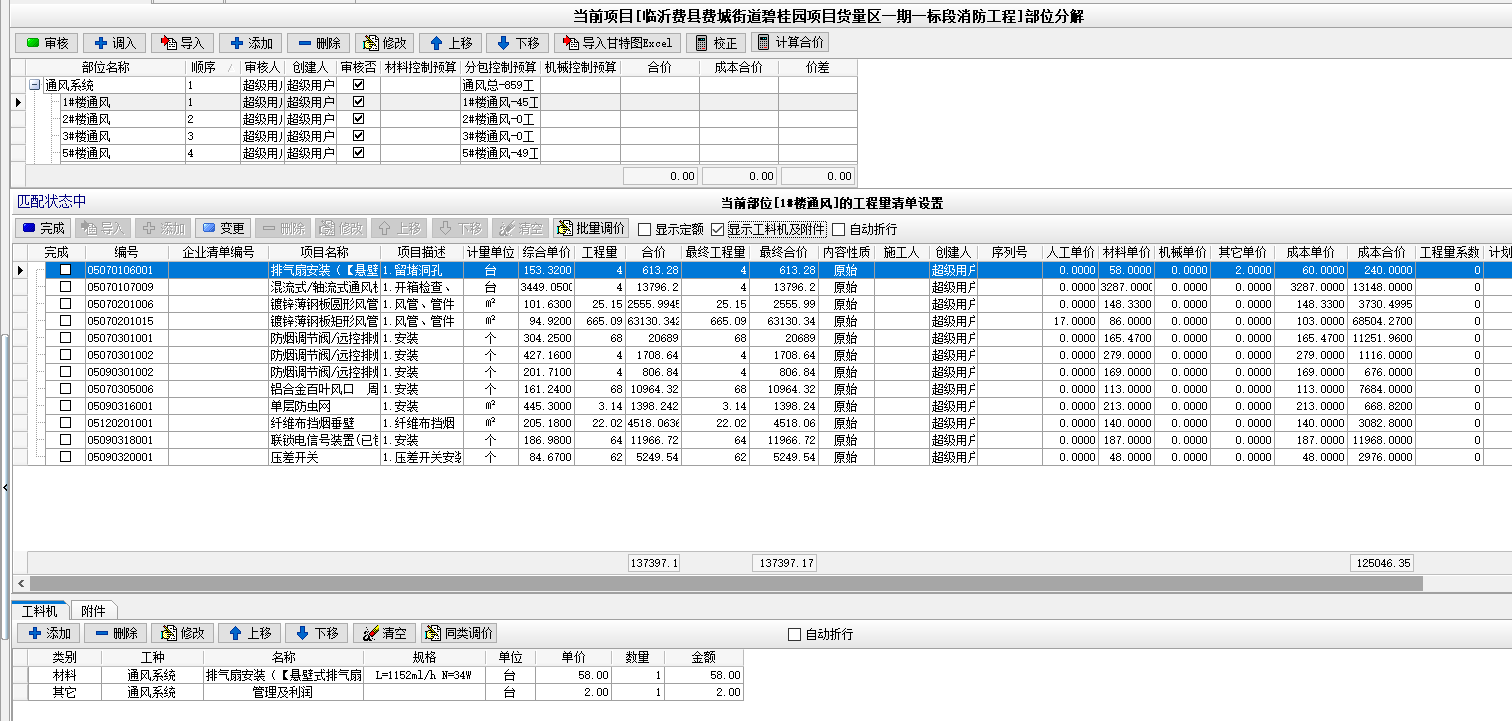 工程管理模塊下,【部位分解及工程量清單】中,部位部位分解中增加‘合價’、‘成本合價’和‘價差’三個字段,旨在體現(xiàn)出當前部位下合同清單金額、成本清單金額(由企業(yè)清單中工料機計算得出)和兩者的差值形成的價差(實際就是利潤)。如下圖所示