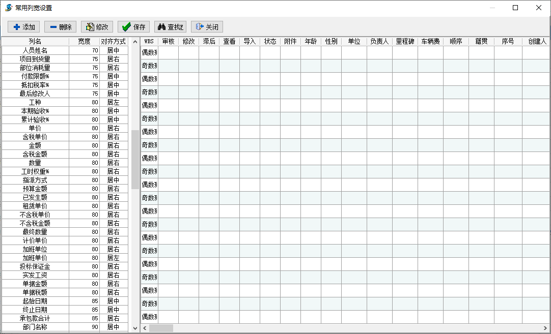 對(duì)單據(jù)表格中不同字段的列寬做單獨(dú)設(shè)置,分字段名、寬度和對(duì)齊方式3種設(shè)置,字段名必須與列表或查詢表格中的字段名一致,否則無(wú)法生效;寬度為字段的顯示寬度,原則為恰好或更好顯示當(dāng)前字段內(nèi)容為準(zhǔn);對(duì)齊方式分居中、居左和居右3種方式,原則上推薦數(shù)字類(lèi)居右顯示,其他字段可根據(jù)用戶個(gè)體習(xí)慣自行設(shè)置,設(shè)置界面圖如下: