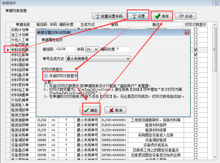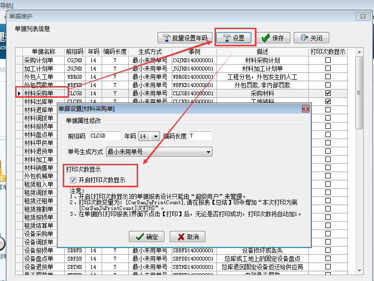 登錄超級用戶,在菜單欄【系統】-【單據維護】找到對應業務單據,點擊設置按鈕在開啟打印次數顯示處打上對勾,然后點擊確定。如下圖: