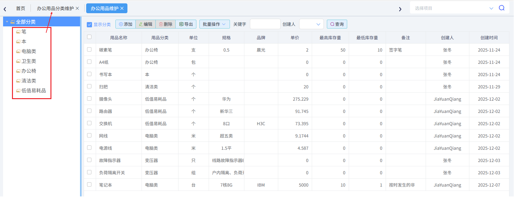 左側(cè)為辦公用品分類(lèi)維護(hù)目錄,右側(cè)為用品明細(xì)內(nèi)容。如下圖